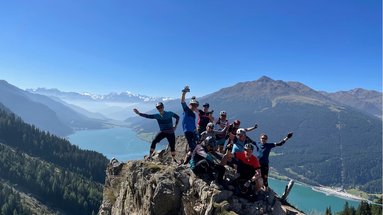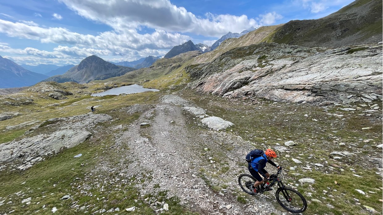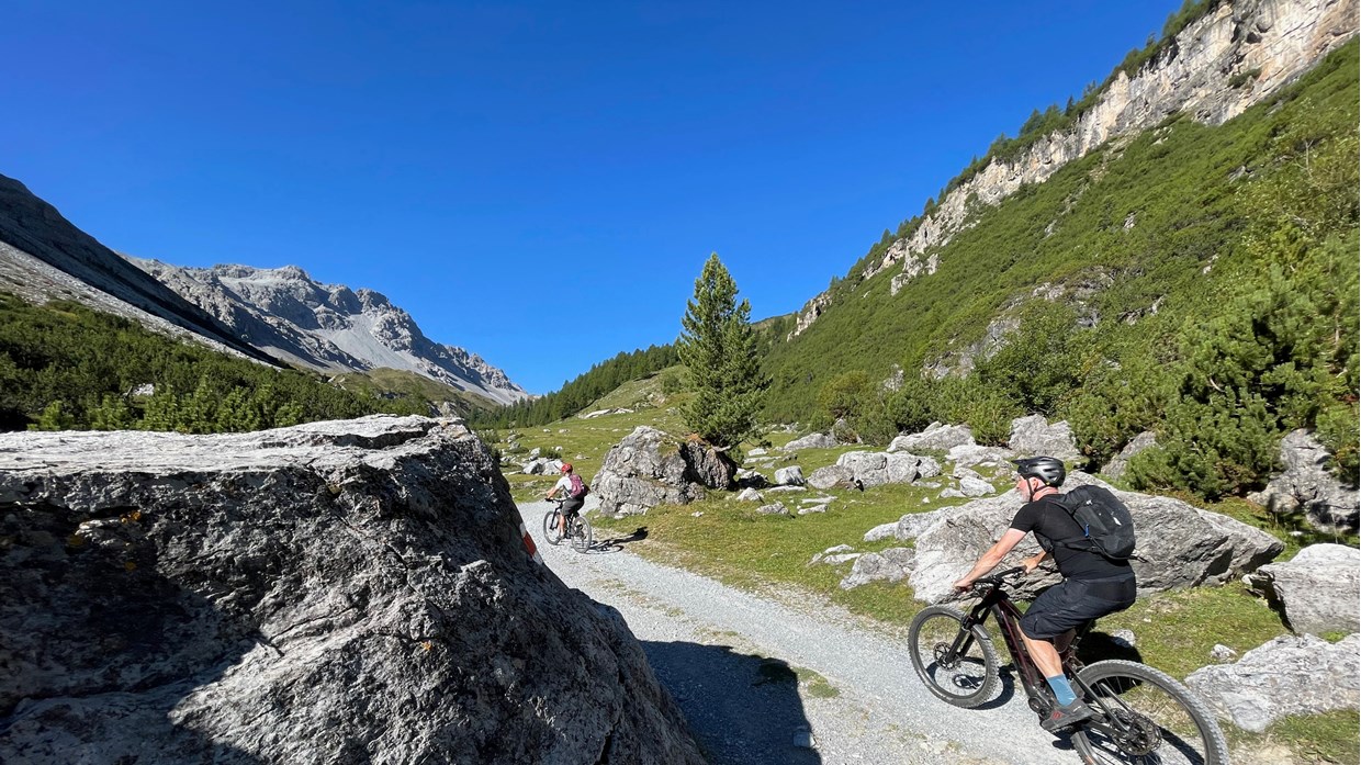 The gondola brings us up to 2.200m. Via the legendary Plamort we reach the Reschen lake with the church tower of Graun. The Almtrail and Plamorttrail are obligatory here. The breathtaking view of the snow-covered Ortler characterises the varied bike day. We reach the Swiss National Park and spend the night in Sta. Maria.