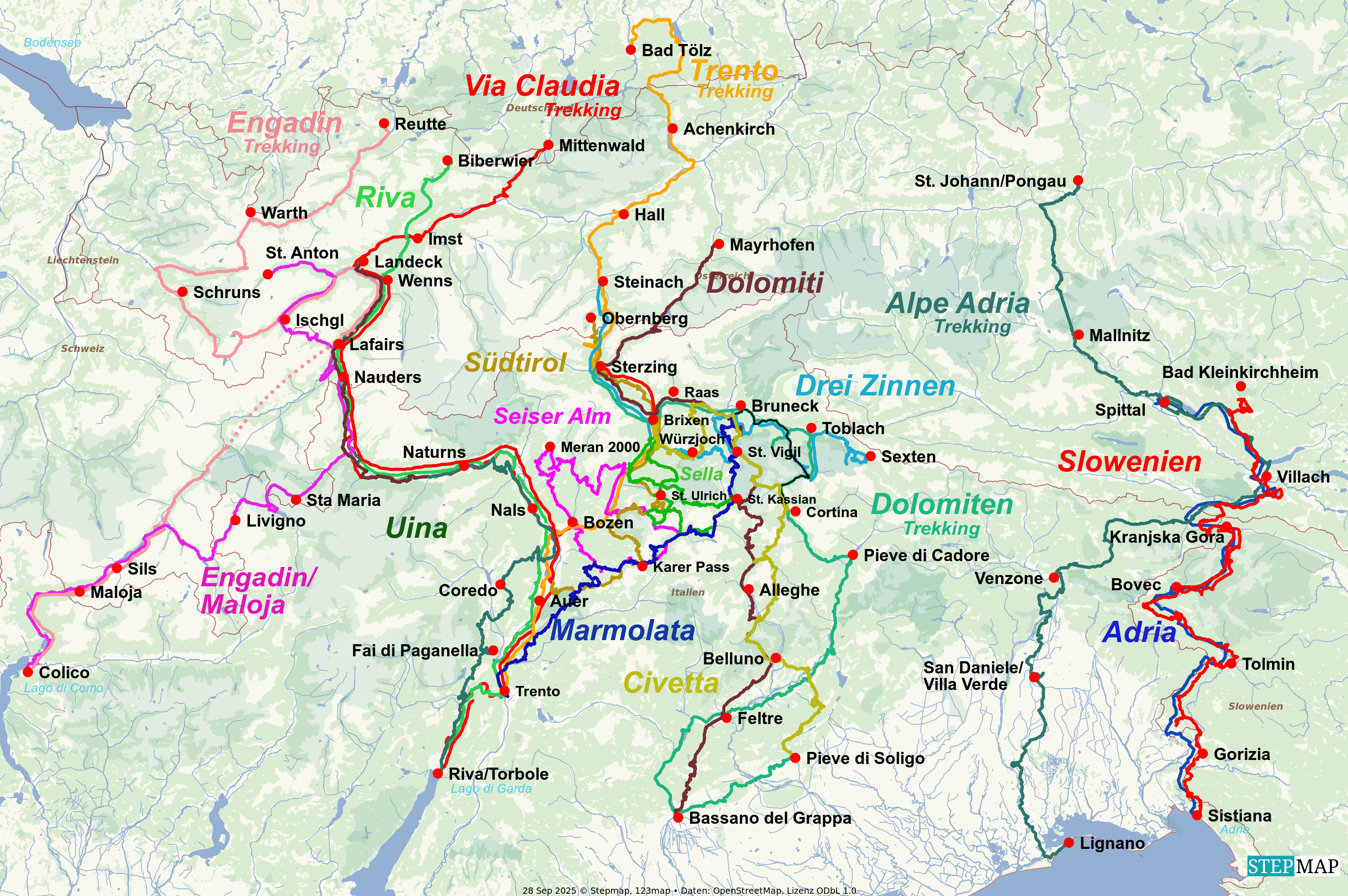 More and more bikers manage the uphill flow with electric assist. On our regular mountainbike-transalp tours pedelecs are not allowed. We do not want to mix the groups. Only on our trekkingbike-transalp tours we make an exception, if previously announced. Nevertheless there are also exclusive dates for E-Bikes on our trekking bike tours as well.